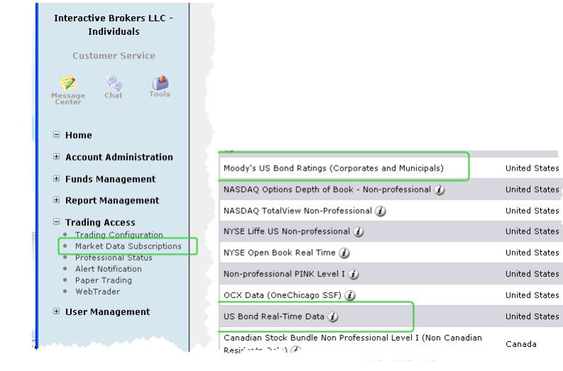 In addition, you must subscribe to the Bond Data package, which includes real-time data for US treasury, corporate and municipal bonds, and Moody’s Ratings, which supplies ratings for both US corporate and municipal bonds.