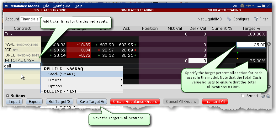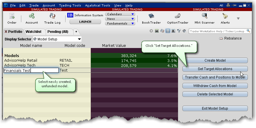 Choose the unfunded model and click Set Target Allocations. The Rebalance window opens.