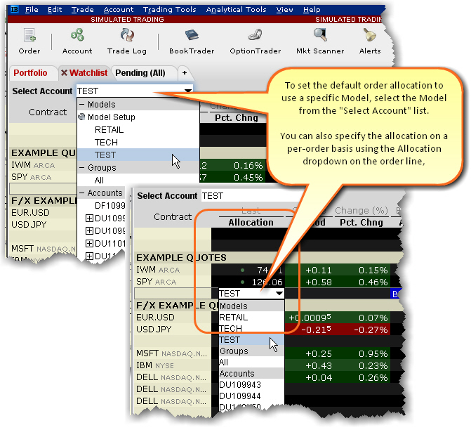Once you have received an initial cash investment in a model, you can populate a model with investment instruments. Perform this action as if you were purchasing shares for a client account but select the Model as the allocation.