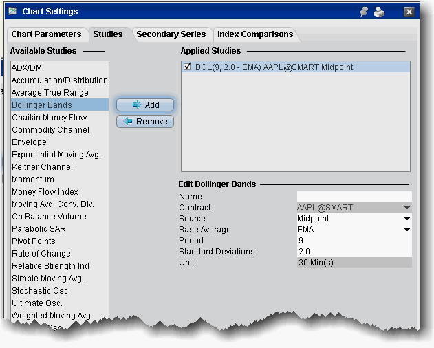 Bollinger Bands measure volatility by plotting a series of three bands. The middle band represents the moving average (SMA or WMA or EMA). The upper band is a set number of standard deviations higher than the middle band (generally 2), and the lower band is a set number of standard deviations (generally 2) lower than the middle band. You set the distance of standard deviation when you create the study.