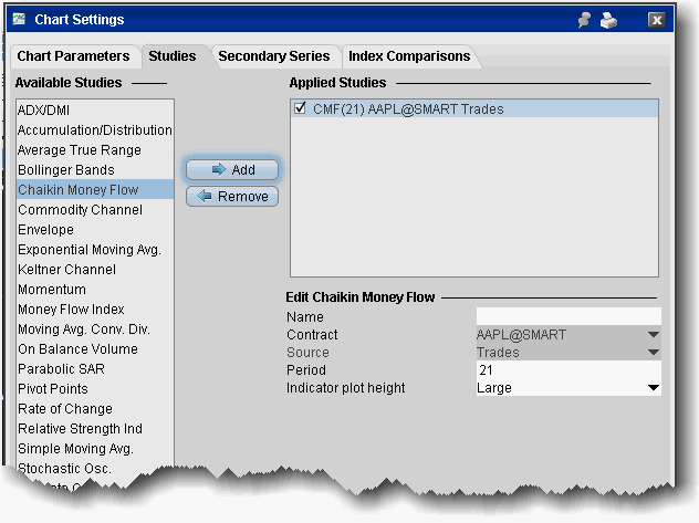 The Chaikin Money Flow Oscillator is calculated using the Accumulation/Distribution Line. It takes the cumulative total of the Accumulation/Distribution values for 21 periods (or X number of periods if you elect to change this value) divided by the cumulative total of volume for 21 (or X) periods.