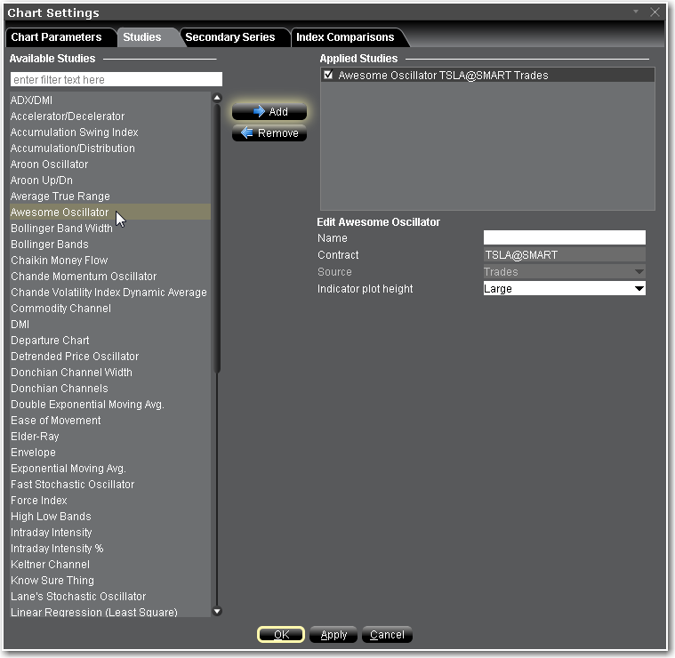 The Awesome Oscillator is an indicator used to measure market momentum. AO calculates the difference of a 34 Period and 5 Period Simple Moving Averages. The Simple Moving Averages that are used are not calculated using closing price but rather each bar's midpoints. AO is generally used to affirm trends or to anticipate possible reversals.