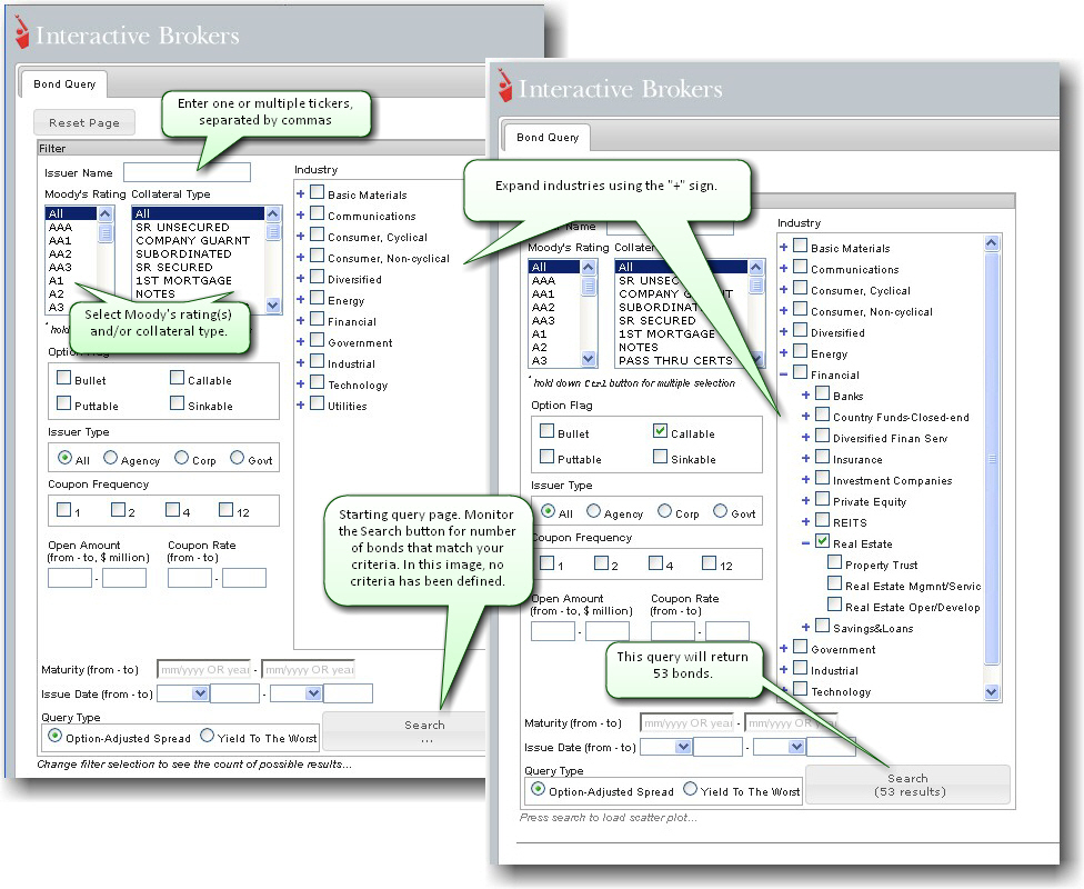 You can query for bonds issued by agencies, government or corporate bonds. Use these fields to define bond search criteria (similar to scanners). The less criteria you specify the larger the number of bonds that will be returned. You must define at least one criterion for the search to begin.