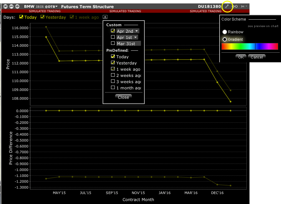 View the real-time and historical term structure of futures prices with the new Futures Term Structure window. This window displays a split chart that shows the real-time and historical settlement prices of the existing futures contracts for the given underlying (top chart) and the differences between the older settlement price curves and the most recent selected curve (bottom chart).